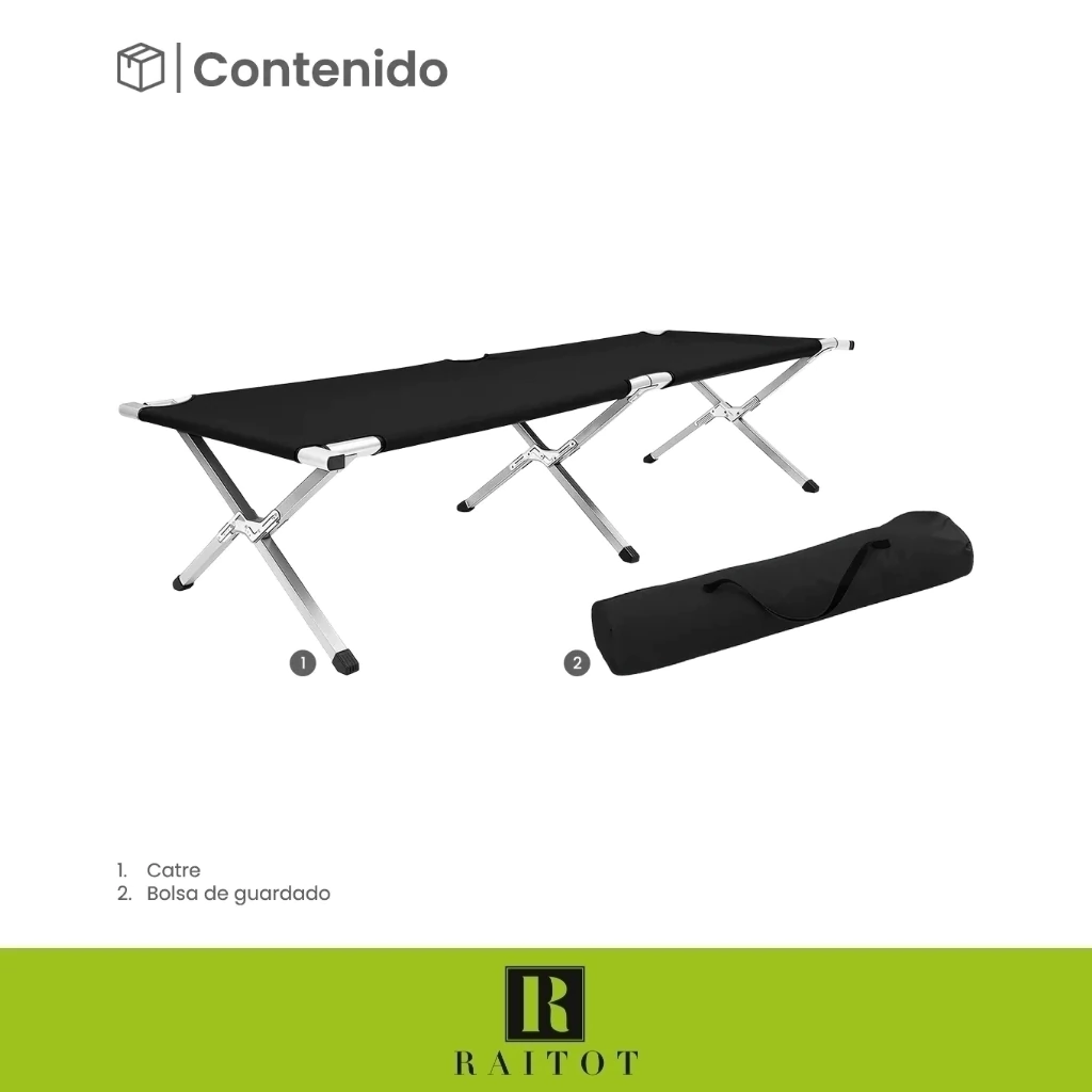 El Catre Portátil de Camping Raitot es una solución cómoda, práctica y funcional para descansar durante actividades al aire libre. Su diseño elevado permite dormir separado del suelo, brindando mayor confort y protección frente a la humedad, el frío y las irregularidades del terreno. Ideal para camping, pesca, senderismo, viajes o como cama auxiliar, combina resistencia, ligereza y fácil transporte.