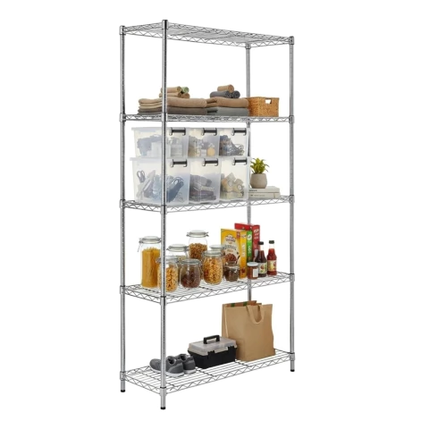 La Estanteria Metalica de 5 Niveles de 180 cm Raitot está diseñada para ofrecer una solución sólida y eficiente en la organización de hogares, oficinas, depósitos y comercios. Su estructura en hierro cromado aporta estabilidad y resistencia al uso intensivo, mientras que sus cinco niveles de almacenamiento permiten acomodar productos, herramientas y objetos de distintos tamaños gracias a su sistema de altura ajustable. El diseño abierto facilita la visualización del contenido y asegura un acceso rápido y cómodo, integrándose con facilidad en cualquier ambiente.