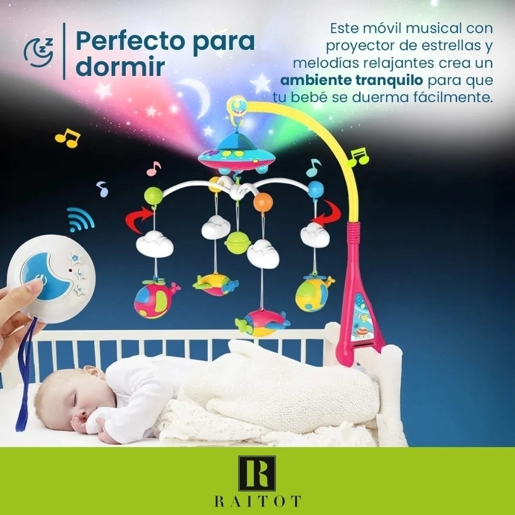 El Móvil Musical Raitot es el aliado ideal para acompañar a tu bebé en sus momentos de descanso. Diseñado para estimular los sentidos y generar un ambiente de calma, combina luces de colores, suaves melodías y una adorable proyección de estrellas que ayudan a que tu pequeño se relaje y concilie el sueño más fácilmente. Su colgante giratorio y control remoto lo hacen práctico y funcional desde el primer mes de vida.